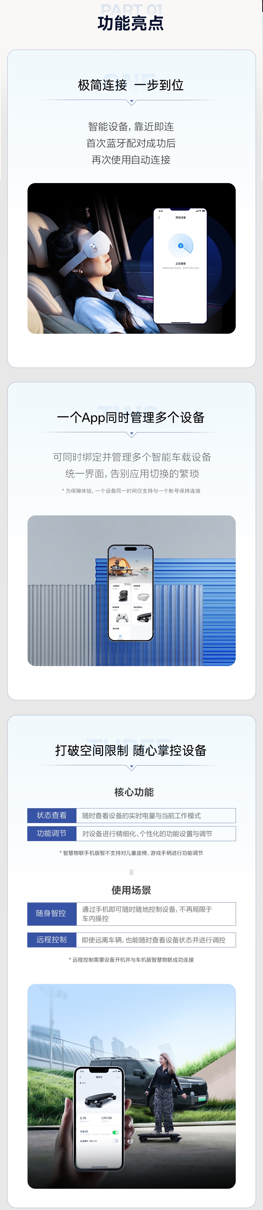 通过手机即可随时随地控制设备,不再局限于车内操控;即使远离车辆,也能随时查看设备状态并进行调控。