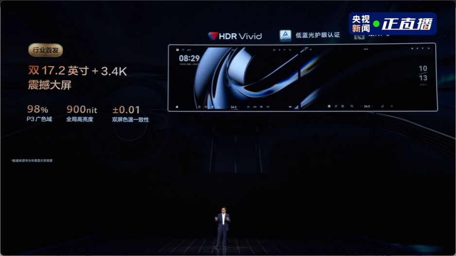 移动影音方面,华为乾崑在鸿蒙座舱 6 上发布双 17.2 英寸 + 3.4 K 的规格。具备 98% P3 广色域以及 900 nit 全局高亮度,另外 ±0.01 双屏色温一致性,同时获得 HDR Vivid 和低蓝光护眼双重认证。双 NFC 交互支持主副驾无缝流转体验,21:10 超宽屏比例设计令视野更开阔、布局更实用。中控屏支持全新智慧分屏,副驾专享 21:9 电影大片满屏观影体验,屏幕显示面积提升 30%,沉浸感更强。