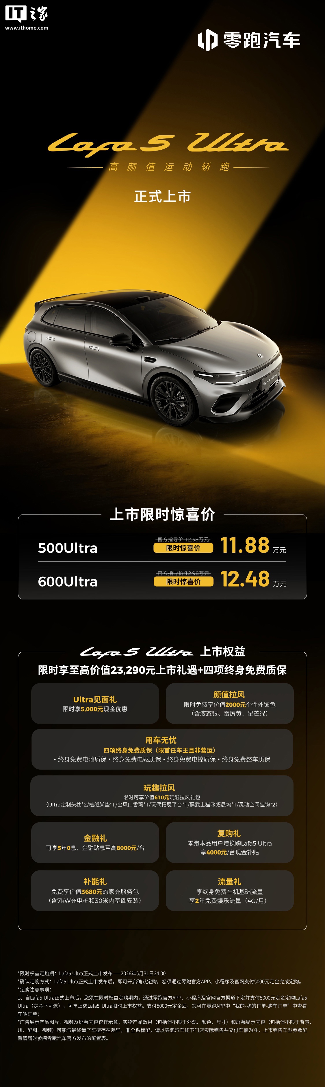 IT之家 4 月 24 日消息,零跑 Lafa5 Ultra 今日在 2026 北京车展上市,限时惊喜价 11.88 万元起: