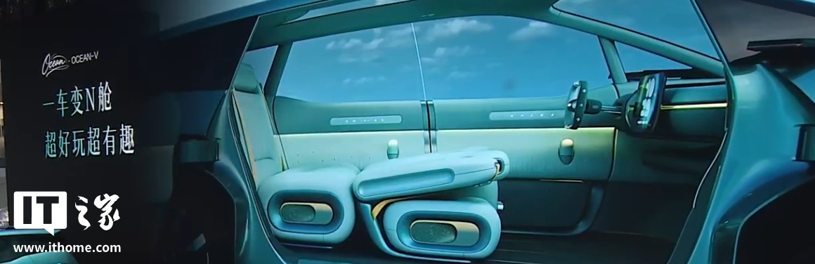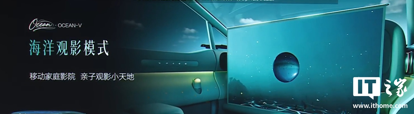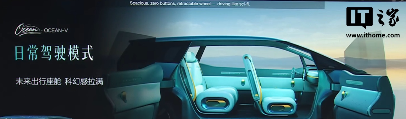 内饰方面,Ocean-V 概念车全舱 0 物理按键,可一键进入“海洋观影模式”,方向盘收缩,仪表台翻转出一个大幕布。