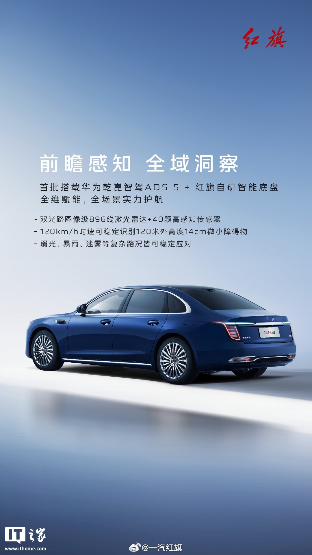 据介绍,全新一代红旗 H9 将搭载华为乾崑智驾 ADS 5 + 鸿蒙智舱 HarmonySpace + 红旗自研智能底盘。新车配双光路图像级 896 线激光雷达 + 40 颗高感知传感器,宣称 120km/h 时速可稳定识别 120 米外高度 14cm 微小障碍物。