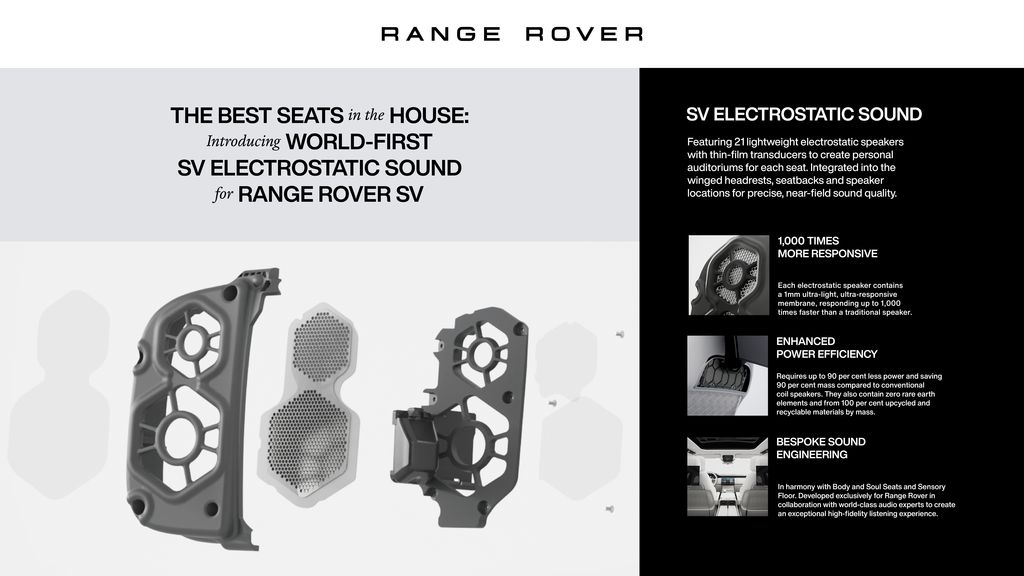 音响系统是此次升级的核心亮点,新车首发车载静电音响技术。系统由 21 个厚度仅 1 毫米的超轻振膜传感器组成,响应速度比传统扬声器快 1000 倍,能够提供录音室级的高保真音频体验。该系统重量与能耗均比传统线圈扬声器降低 90%,且完全不含稀土元素,由 100% 可回收材料构建。