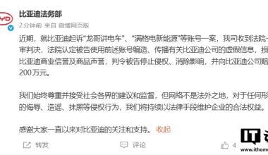 比亚迪起诉“龙哥讲电车”一审胜诉 获赔200万元