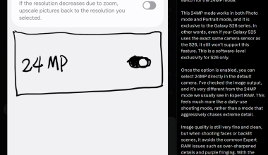 三星Galaxy S26系列将首次提供2400万像素模式开关,需手动开启,支持拍照与人像模式,影像品质清晰,规避RAW模式问题,但处理需3秒,此功能将独占Galaxy S26系列。