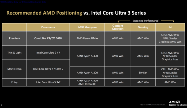 AMD抢先公布酷睿Ultra300系列竞品对比数据,强调RyzenAI系列性能优势,在高端、主流及轻薄本、入门级市场均展现出领先态势。