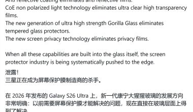 省下贴膜钱:三星 Galaxy S26 Ultra 手机被曝配“超高强度”康宁大猩猩玻璃保护