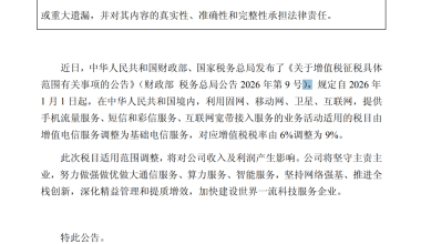 三大运营商:电信服务增值税税目适用范围调整税率由 6% 调至 9%