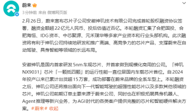 传蔚来芯片公司安徽神玑完成首轮融资,投后估值近百亿元