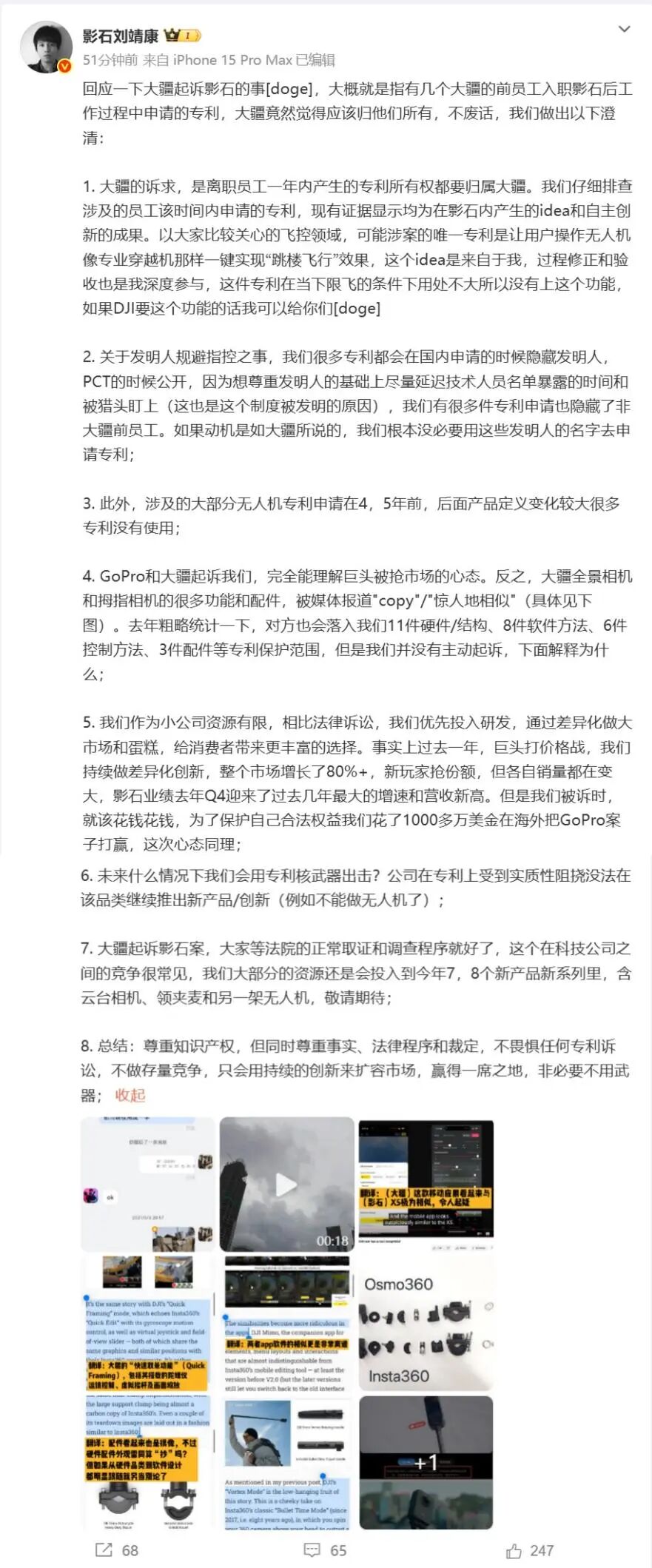 影石 CEO 刘靖康回应大疆起诉:尊重知识产权,但同时尊重事实