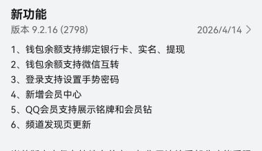 QQ鸿蒙版App推送9.2.16正式版升级,新增钱包余额绑定银行卡、实名、提现及微信互转功能,登录支持手势密码,新增会员中心,QQ会员可展示铭牌和会员钻,频道发现页更新。