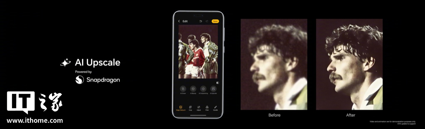 另外,在高通骁龙 8 至尊版处理器加持下,荣耀推出了 AI 超清影像功能。该功能专门恢复褪色旧肖像,智能处理老照片问题,宣称“让珍贵影像再现清晰与生动”。