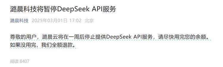 紧接着,他的潞晨科技宣布将在一周后停供DeepSeek API。