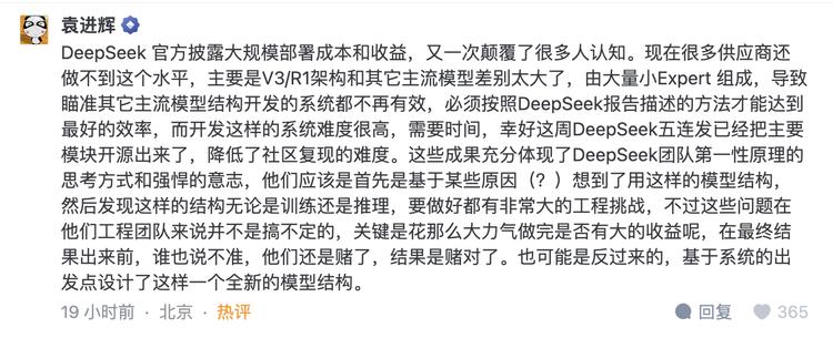 而这次DeepSeek官方直接“让人看到”了这是可行的。袁进辉也在DeepSeek文章发布一小时后就火速评论道,“又颠覆了很多人的认知”,他认为“很多供应商做不到这个水平”,"MaaS能否成功,关键在于技术实力和用户基础。"