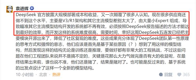 这个问题的答案藏在袁进辉的回复中:现在很多供应商做不到这个水平,主要是V3/R1架构和其他主流模型的差别太大了,MaaS厂商需要按照DeepSeek的报告调,才能达到最好的效率。