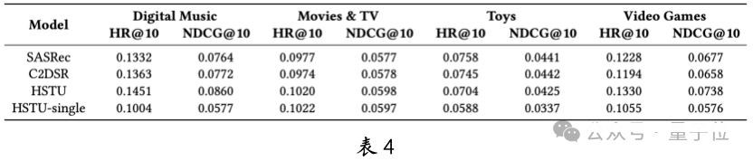 HSTU 在多域、多行为和辅助信息等复杂场景中表现出色。以多域为例,HSTU 在 AMZ-MD 的四个域中始终优于基线模型 SASRec 和 C2DSR(见表 4)。