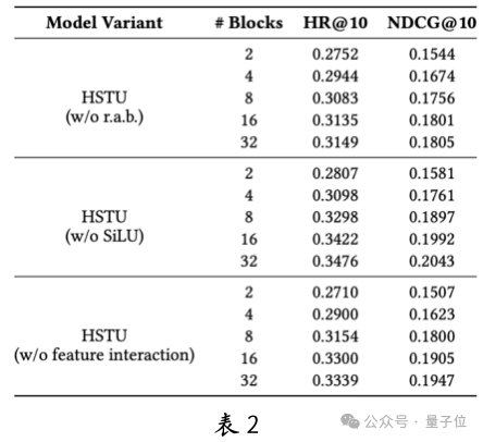 为了探究 HSTU 等生成式推荐模型的可扩展性来源,团队进行了消融实验,分别去除了 HSTU 中的关键组件:相对注意力偏移(RAB)、SiLU 激活函数,以及特征交叉机制。