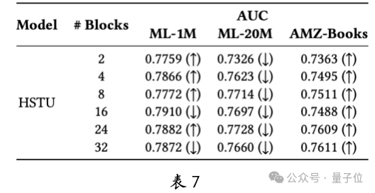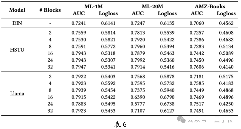 排序是推荐系统中重要的一环,团队深入探讨了生成式推荐模型在排序任务中的有效性和扩展性。正如表 6 所示,生成式推荐大模型在性能上显著优于 DIN 等传统推荐模型。尽管在小规模模型下,Llama 的表现优于 HSTU,但 HSTU 在扩展性方面更具优势,而 Llama 在扩展性上显得不足。