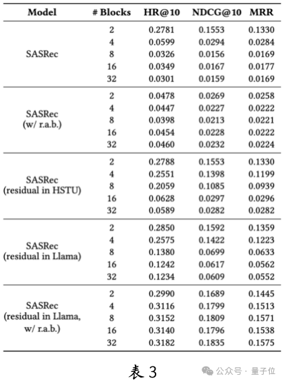 为了进一步分析赋予模型扩展定律的因素,团队比较了 SASRec 与扩展性良好的 HSTU 和 Llama 的区别,发现主要差异在于 RAB 和注意力模块内的残差连接方式。