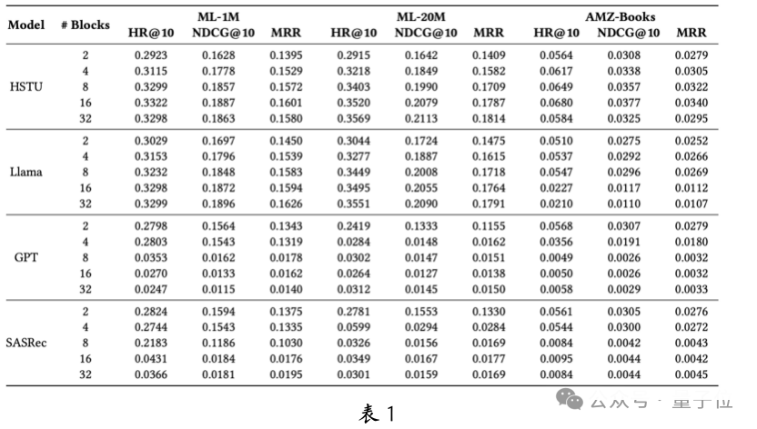 为了评估生成式推荐大模型在不同架构下的扩展性,团队对比了 HSTU、Llama、GPT 和 SASRec 四种基于 Transformer 的架构。