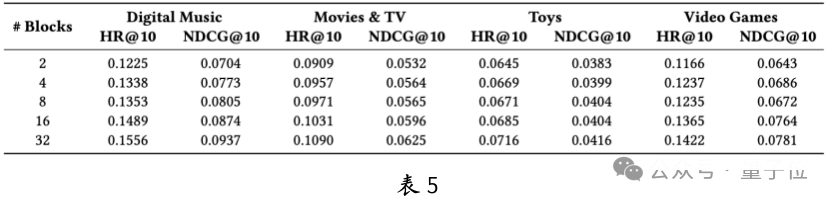 团队还研究了负采样率和评分网络架构对排序任务的影响,并进行了全面分析。此外,还探讨了缩减 embedding 维度对性能的影响。缩小 embedding 维度(表 7)提升了小数据集 ML-1M 和 AMZ-Books 的性能,但在大数据集 ML-20M 上则有所下降。这表明,推荐大模型的扩展定律不仅受垂直扩展(注意力模块数量)影响,也受水平规模(embedding 维度)影响。