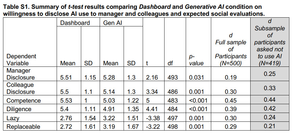 在第一个实验中,参与者需要设想自己使用 AI 工具还是传统仪表板(dashboard)创建工具来完成工作任务。结果显示,选择 AI 工具的参与者普遍预期自己会被认为懒惰、能力不足、不够勤奋,甚至更容易被替代。