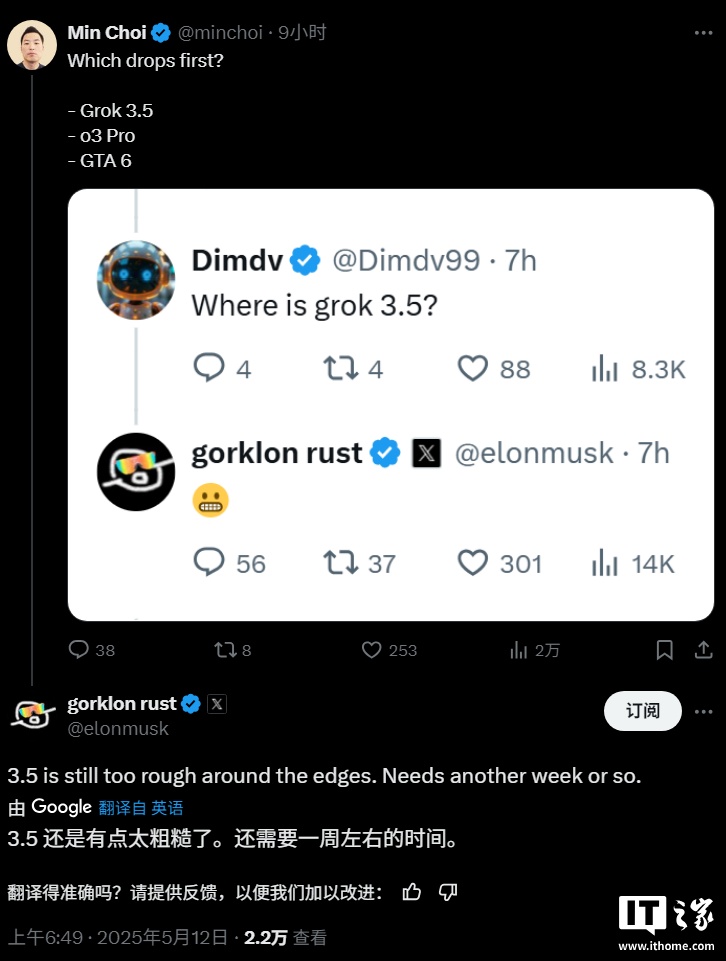 IT之家 5 月 12 日消息,有网友日前提问“Grok 3.5、GPT-o3 Pro 和 GTA 6 哪个会最先发布?”