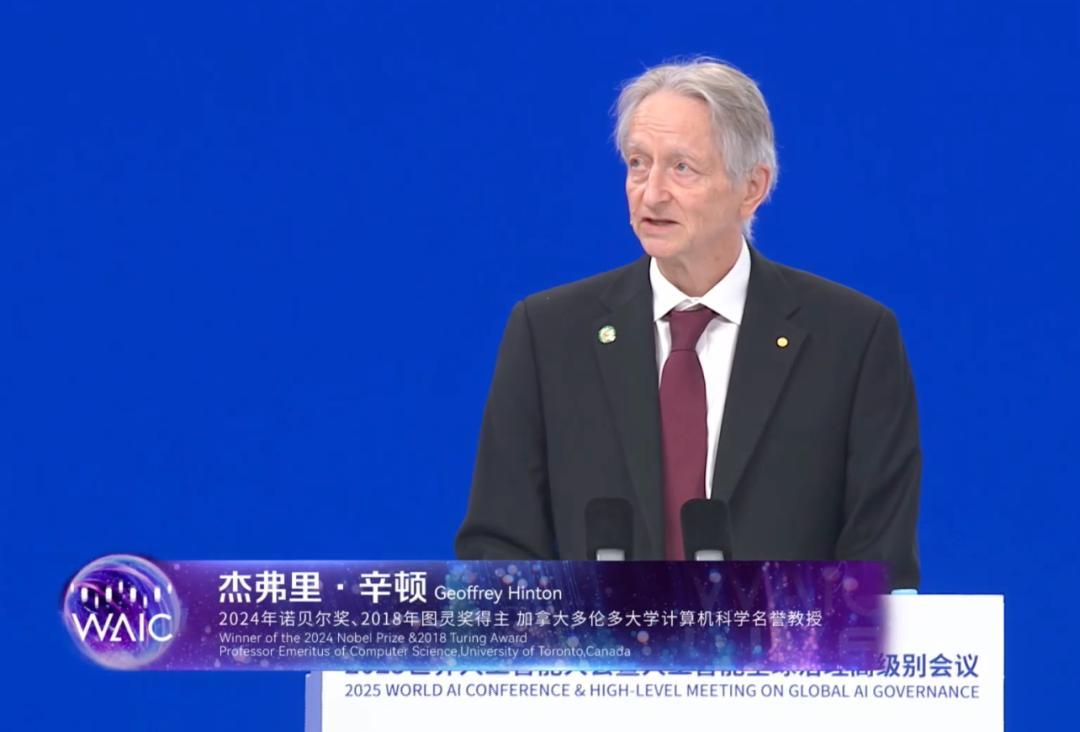 “深度学习教父”、图灵奖、诺贝尔奖得主杰弗里·辛顿(Geoffrey Hinton)是最受关注的演讲者,他真人出席,发表了名为《数字智能是否会取代生物智能?》的演讲。这也是他在中国的首次公开演讲。