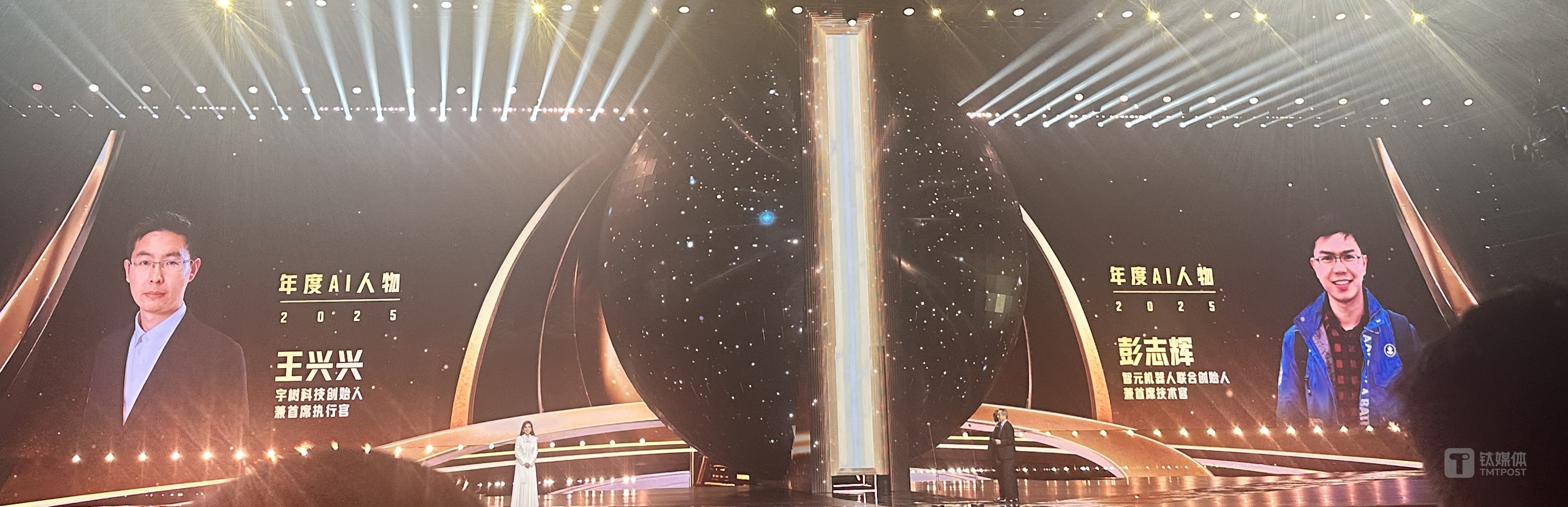 7月26日晚举行的一场AI盛典上,宇树科技创始人、CEO王兴兴,与智元机器人联合创始人兼首席技术官彭志辉(稚晖君)一起获得了“2025年度AI人物”称号,其他8位年度AI人物还包括智谱CEO张鹏、强脑科技创始人韩璧丞等。