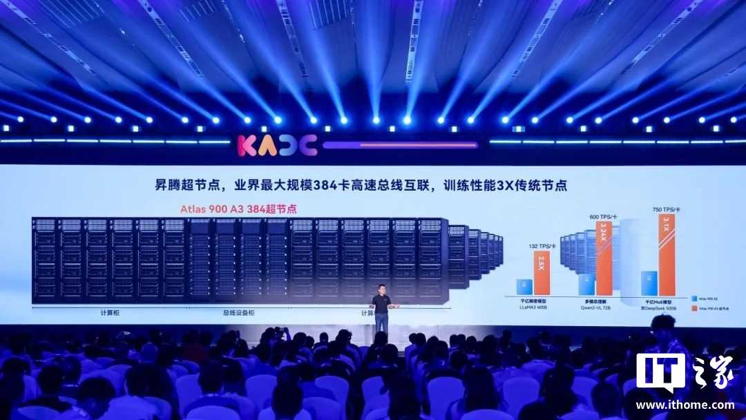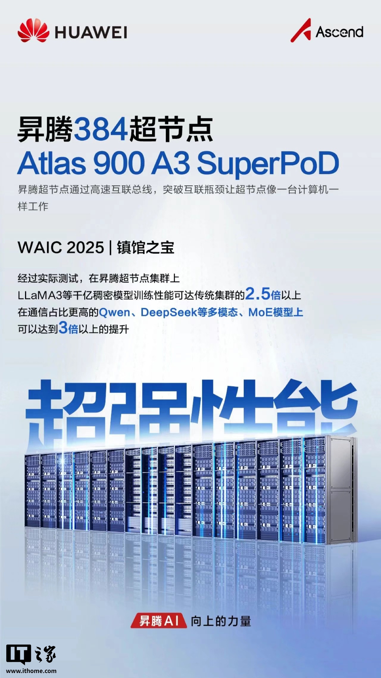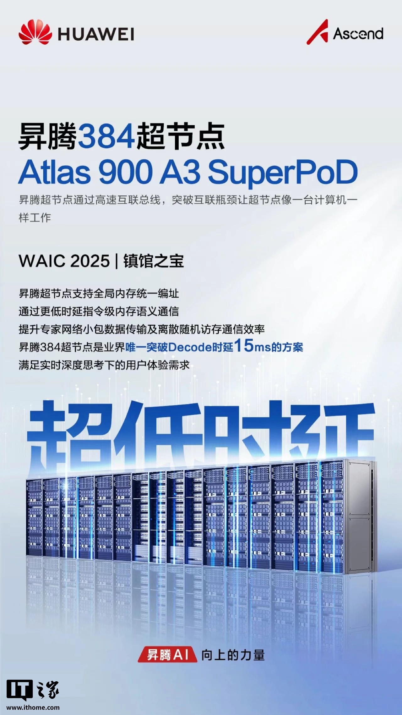 IT之家 7 月 28 日消息,2025 世界人工智能大会(WAIC)于 7 月 26 日在上海世博中心启幕。本次 WAIC,华为首次线下展出昇腾 384 超节点 Atlas 900 A3 SuperPoD,该产品基于超节点架构,通过总线技术实现 384 个 NPU 之间的大带宽低时延互联,解决集群内计算、存储等各资源之间的通信瓶颈。