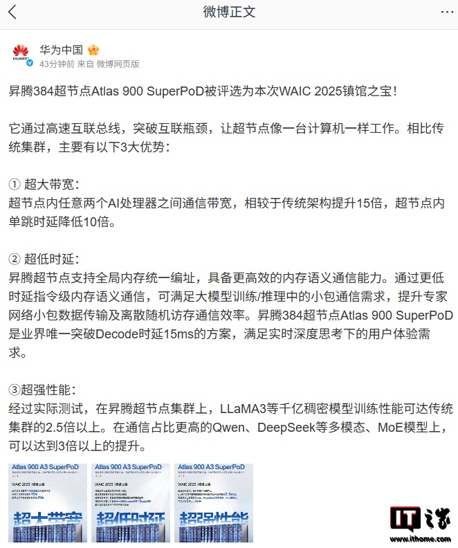 据华为中国官方消息,昇腾 384 超节点 Atlas 900 SuperPoD 被评选为本次 WAIC 2025 镇馆之宝,其主要有以下 3 大优势: