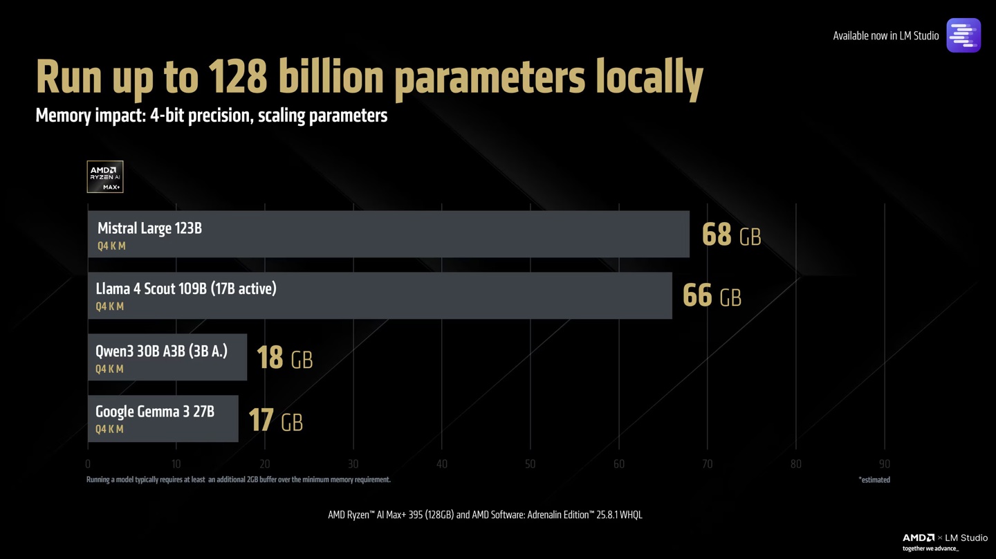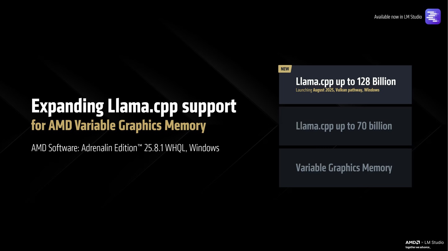 AMD 表示,Llama 4 Scout 109B 模型之前只能在数据中心级硬件上运行,但现在通过 Variable Graphics Memory 功能,轻薄型 PC 也能实现。
