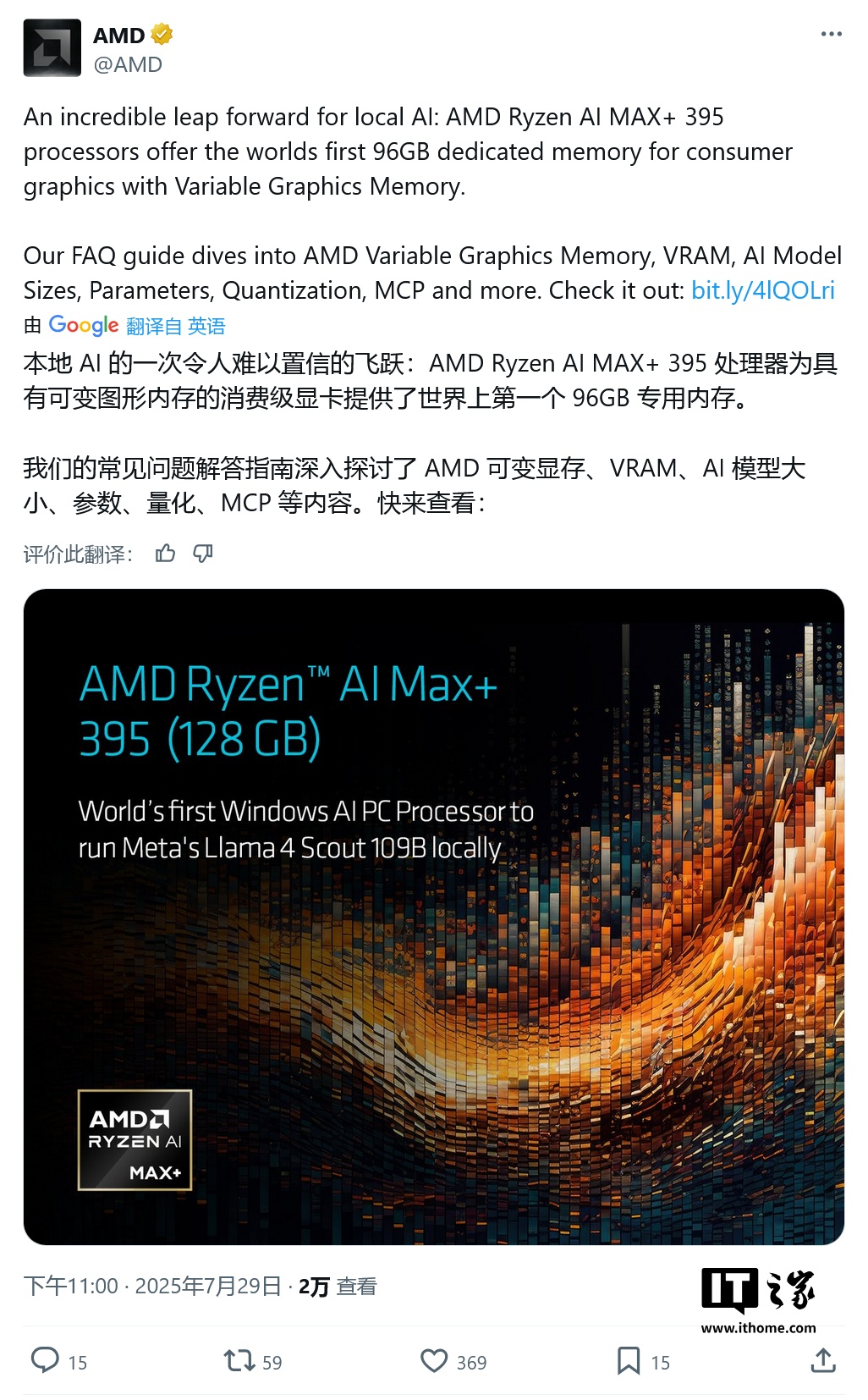 IT之家 7 月 30 日消息,AMD 公司昨日(7 月 29 日)发布博文,宣布在 Windows 系统下搭配 128GB 内存,其 Ryzen AI MAX+ 395 成为全球首款可以在消费级显卡上最高支持 96GB 显存,本地完整运行 Meta 的 Llama 4 Scout 109B(激活参数为 17B)模型的 AI 处理器。