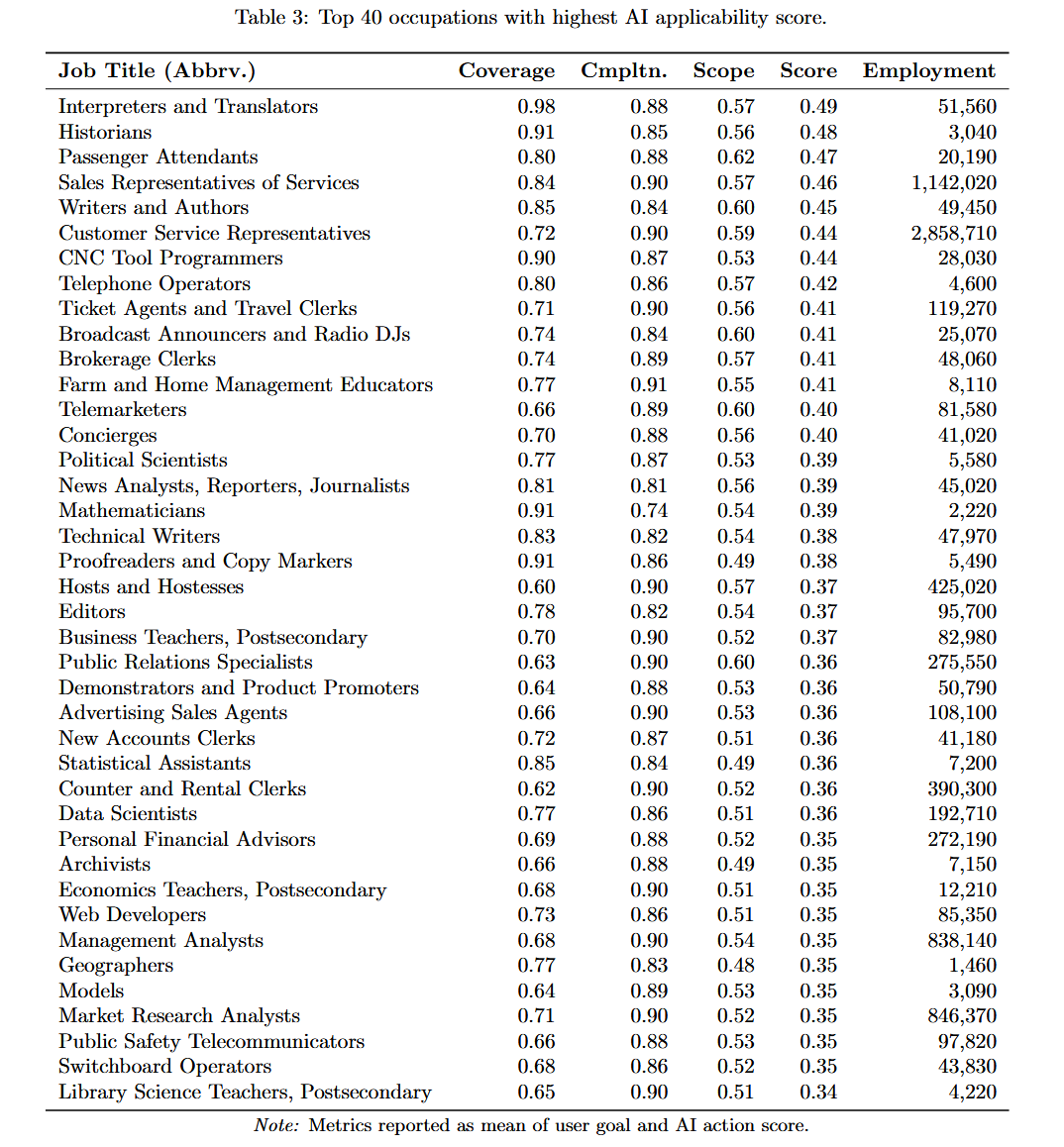 基于报告数据,翻译和口译人员受 AI 冲击最为严重,现代 AI 工具已能提供快速的多语言语音旁白和实时翻译,这些岗位与 Copilot 当前能做的事情有最大的重合。