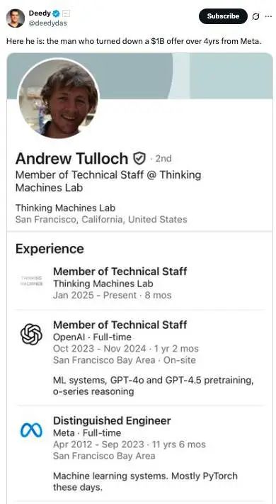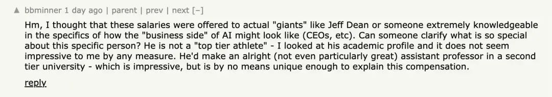 “我原以为这种薪酬是留给真正的‘巨擘’,比如 Jeff Dean 这样的顶级技术专家,或者那些深谙 AI 商业模式的高管(比如 CEO)……但这位年轻人到底特别在哪?他并不是‘顶级运动员’级别的存在。我查了下他的学术背景,说实话,并没有什么令人惊艳的地方。大概能当个二流大学的助理教授——当然这也很了不起,但远远不足以支撑 2.5 亿美元的报价。”