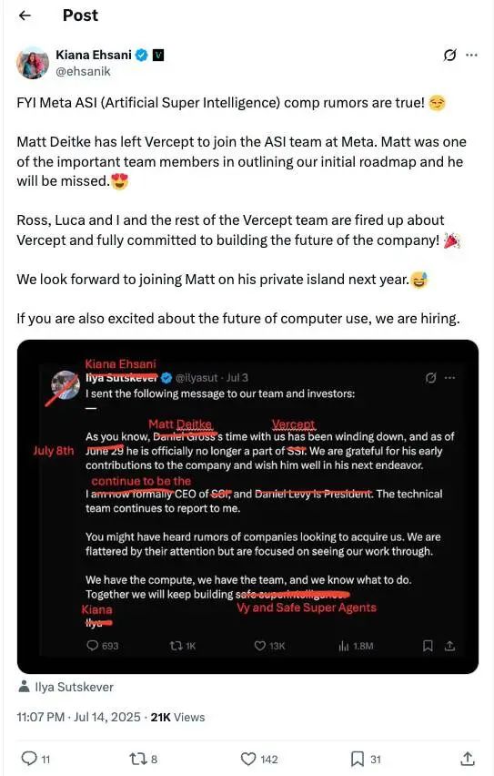 Meta 的 ASI(人工超级智能)团队的薪资传闻是真的!Matt Deitke 已经离开 Vercept,加入了 Meta 的 ASI 团队。Matt 是我们制定最初产品路线图的重要成员之一,他离开后我们会非常想念他......