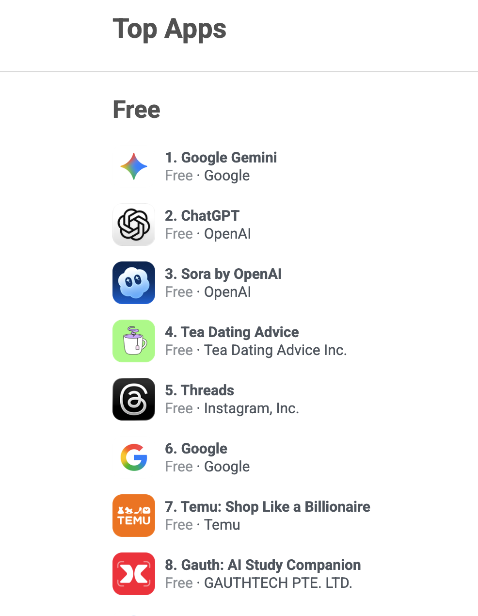 目前,OpenAI在美区App Store免费应用排行榜前三中占据了两款,另一款是排在第二的ChatGPT。不过,它们都落后于谷歌Gemini,该聊天机器人因谷歌Nano Banana图像模型的持续成功而位居第一。
