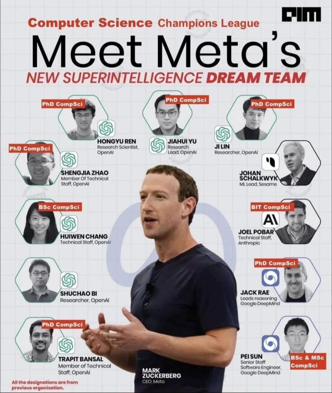 Meta最终从OpenAI、Google DeepMind、Apple、Anthropic和xAI等公司挖来了超过50名AI研究员、工程师及其他员工,并将其AI团队重组为新成立的超级智能实验室 (Superintelligence Labs) 部门。