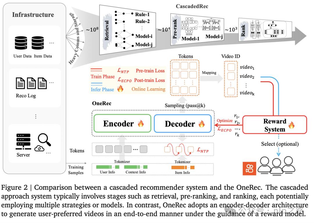 ▲传统的级联推荐系统CascadedRec和新兴的一体化推荐系统OneRec对比示意图