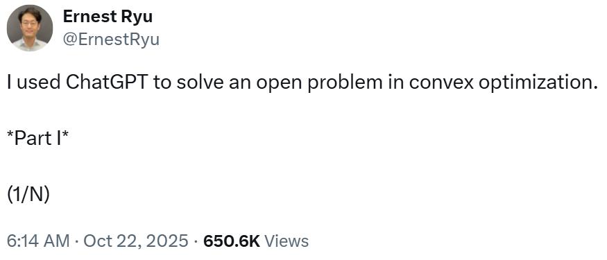 加州大学洛杉矶分校(UCLA)数学教授 Ernest Ryu 发推称:「我使用 ChatGPT 解决了凸优化中的一个未曾被解决的问题。」