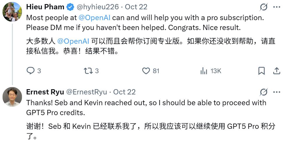 顺带一提,在前述相关推文的评论区,我们也能看到其它一些使用 AI 取得研究进展的信息: