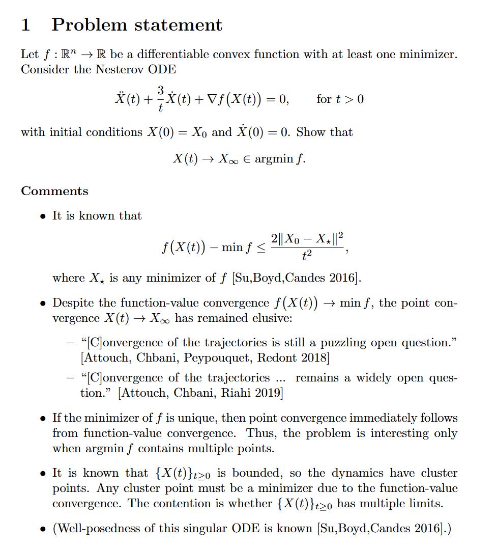 这个数学问题探讨的是一个在最优化理论中非常著名的动态系统,我们可以用一个生动的物理比喻来理解它:一个球在碗里的滚动过程。在这个比喻中,被称为「凸函数」的 f 就代表一个形状完美的碗,它内部光滑,从碗边到碗底的坡度是逐渐下降的,没有任何凹陷或小山丘。这个碗的碗底可能是一个尖锐的点,也可能是一片宽广的平坦区域,这片最低的区域在数学上被称为 argmin f。而 X (t) 则描述了在时间 t 时,一个球在这个碗中所处的位置。截图中的那个核心微分方程,Ẍ(t) + (3/t)Ẋ(t) + ∇f (X (t)) = 0,就是控制这个球如何滚动的「物理定律」。其中,∇f (X (t)) 扮演了「重力」的角色,时刻将球往坡度最陡峭的下方拉扯;而 (3/t)Ẋ(t) 则是一个非常特殊的「摩擦力」,它的奇特之处在于会随着时间的流逝而逐渐减弱。一开始摩擦力很强,能有效减速,但随着时间 t 变得越来越大,这个摩擦效应会变得越来越微弱。整个问题就是从碗壁的某个初始位置 X₀ 将球从静止状态释放,然后观察它在这套独特的物理规则下将如何运动。