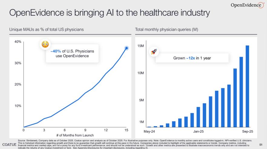 OpenEvidence 的 MAU 已经覆盖了~ 40% 的美国医生,且月度医生查询量在一年内增长约 12 倍,是 AI 赋能医疗领域的典型案例,