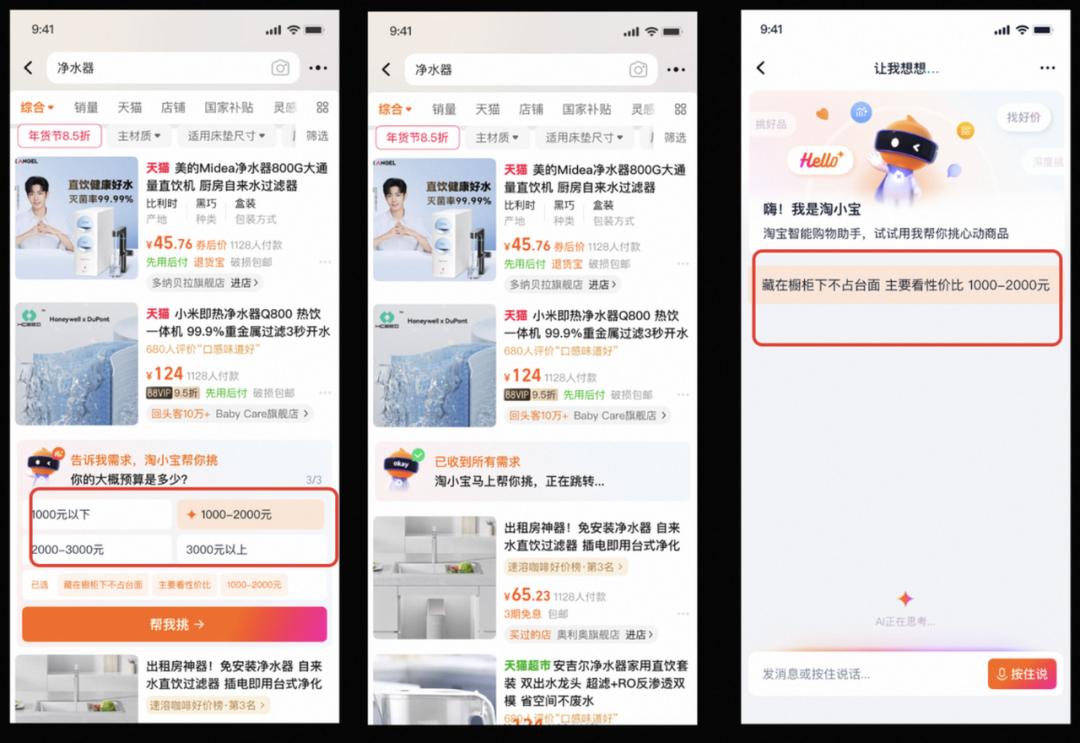 这两个产品都被融入到了淘宝的动线中,一个是在淘宝上拥有独立Tab页,一个则融合在搜索结果页中,随时可以被用户唤起,两者都没有像美团的小美一样呈现出很强的新入口定位,而是依托淘宝App的原有产品外挂新的AI体验。