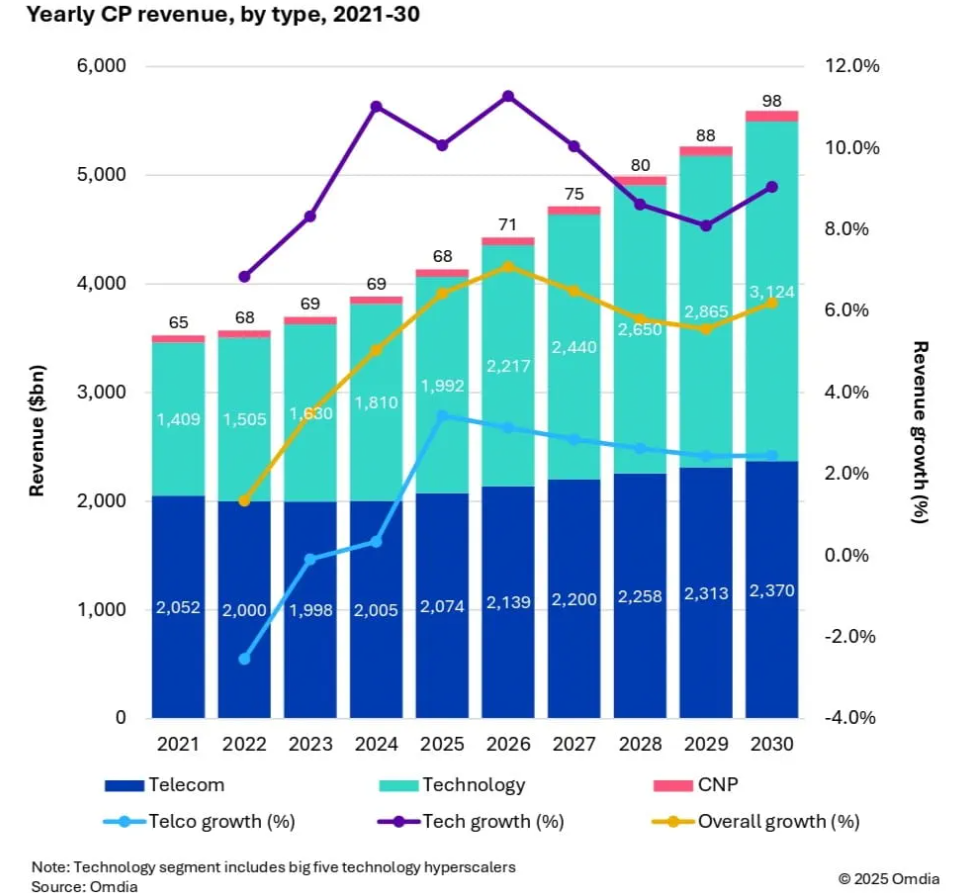 报告显示,传统电信收入将以2.7%的复合年增长率温和增长,而由亚马逊、Alphabet、苹果、Meta与微软等超大规模平台主导的科技板块将保持9.4%的强劲复合年增长率,到2030年将占据通信提供商总收入的55.9%。