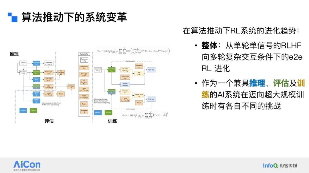 这种训练方法对强化学习算法来说是一个更大的挑战。因此,接下来我会结合强化学习在推理、评估和训练方面的需求,为大家做具体介绍。总体而言,我们可以明显看到一个趋势:从单轮、单信号的 RLHF,正逐渐向多轮复杂交互条件下的端到端强化学习(end-to-end RL)进化。强化学习系统不是一个单纯的训练系统,它既包含推理,又包含评估,还涉及多个模型的训练。因此,在迈向超大规模时,每个维度都面临着不断升级的挑战。同时,我们的挑战还在于如何将这一系列系统整合在一起,使其能够兼容彼此,并提高超大规模系统的效率。