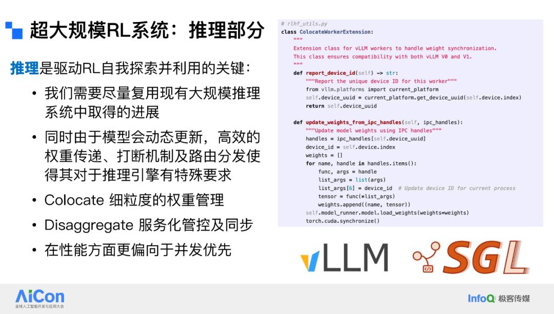 超大规模强化学习系统的推理部分。在超大规模强化学习系统中,推理引擎未来将发挥更大的作用。除了推理引擎本身的挑战外,强化学习的推理还面临额外的挑战。首先,我们需要尽可能复用大规模推理系统中取得的进展,例如我们早期的项目曾使用基于 Hugging Face 的低效推理引擎,其效率瓶颈在推理时间较长时会对系统造成较大影响。因此,我们后来将其切换为利用 Page Attention 加速的 VRM 推理引擎。