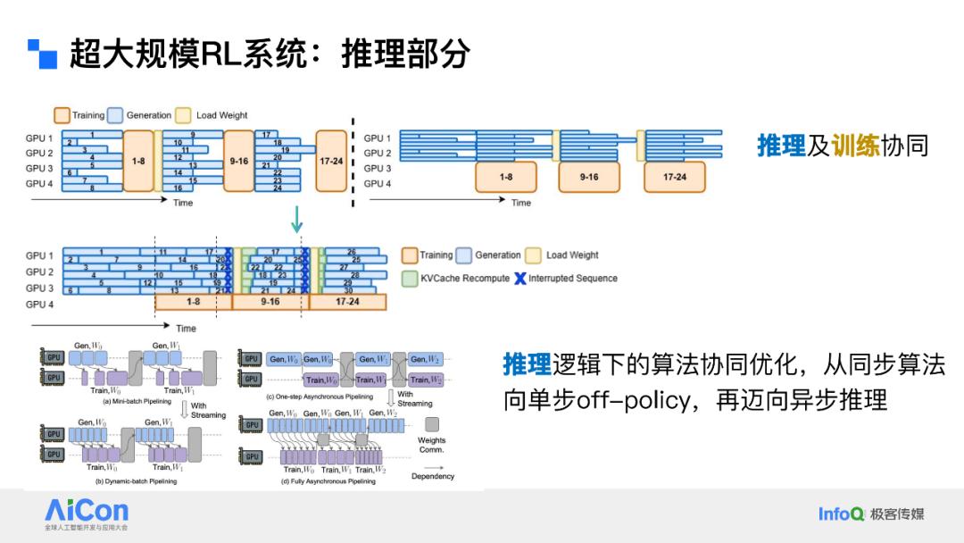 在 AReaL 框架以及后续的相关工作中,提出了推理方面的一些全新挑战,即推理过程必须是可以被打断的。例如,在推理过程中,当推理进行到一半时,如果模型更新了,我们该怎么办?此时需要中断推理,暂停当前的推理进程,等待权重更新完成后再重新计算 KV Cache,然后继续进行推理。推理部分的挑战是巨大的,因为在这里,我们所面对的可能是一个大规模的集群,拥有数百甚至数千张 GPU 卡。