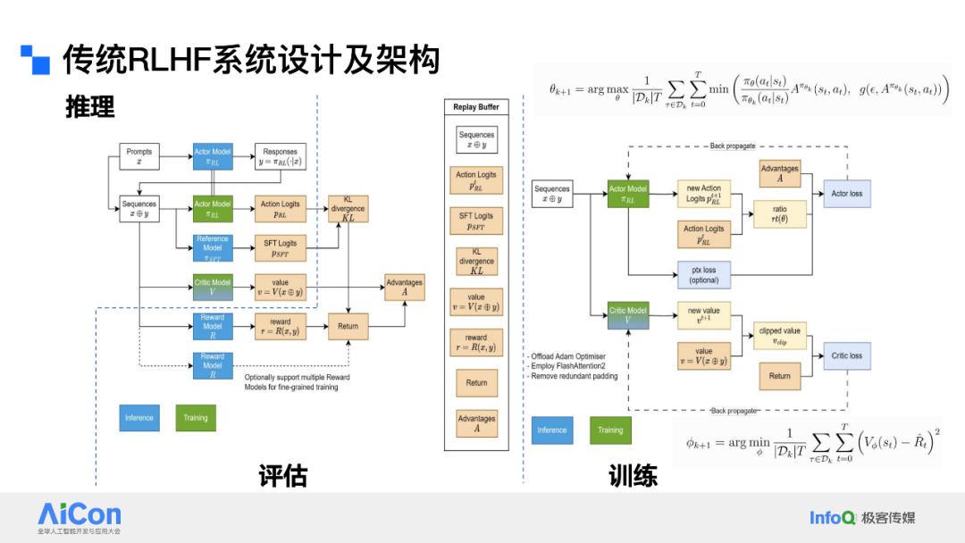 右边的部分才是我们真正所说的训练过程。这个过程其实更接近于传统大模型的预训练和监督微调(SFT)。在传统的 SFT 和预训练过程中,数据都是我们离线静态准备好的。而对于强化学习来说,所有的数据都是通过在线的推理和评估过程动态生成的。在这个训练过程中,还涉及多个模型的同时训练。对于经典的 PPO 算法而言,第一个模型就是我们自身的模型。通过一个相对复杂但实际上并不难理解的 PPO 损失函数,其主要目的是限制更新的步长和幅度,同时在梯度较为自信的情况下,基于优势进行策略函数的更新。优势是指某个行为相对于其他行为的平均好坏值。由于 PPO 是基于 Actor-Critic 架构的,它还有一个 Critic 模型。这两个模型训练完成后,会通过高速互联的方式推送回左边的推理模型中,从而形成一个不断循环的多轮交互模式,让模型能够在线提升自身能力。这就是最传统的 RLHF 训练方式。