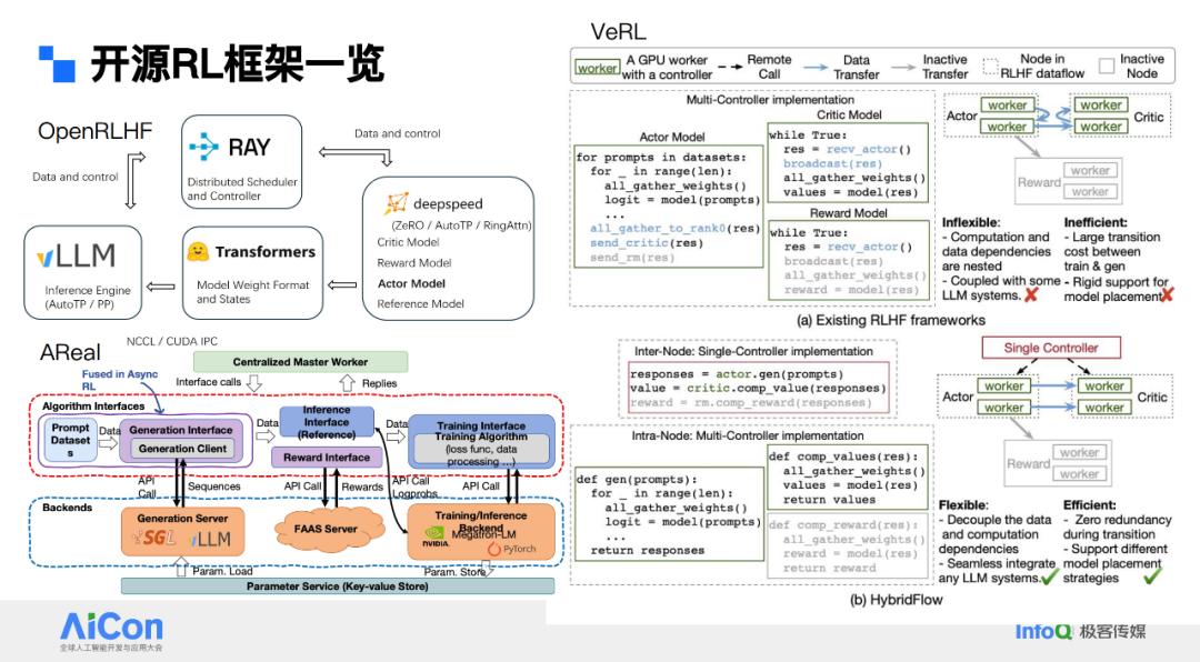 我最早参与的开源社区项目名为 Open RLHF,当时我们的第一版叫 Open LLaMA2。那时 LLaMA2 刚刚推出,表现十分出色,我们觉得有必要打造一个类似的项目,以便国内社区能够有所借鉴和使用。因为当时确实缺乏相关的框架,大家都不清楚该如何入手,可以说是“不识庐山真面目”。于是,我们开发了一套非常简单的系统,它基于 Ray 调度框架,结合了当时在所有领域中效率最高且兼容性最好的调度方式。我们采用了 vLLM 作为推理引擎,DeepSpeed 作为训练引擎,并兼容了 Hugging Face 的整个生态系统,就这样启动了强化学习项目。直到后来,强化学习领域发展迅猛,字节跳动推出了一个名为 VeRL 的框架。VeRL 是基于一篇论文的开源实践,它融合了单控制器的核心优势以及多控制器的灵活性和效率。目前,这一领域生态良好,得到了广泛的应用。此外,还有 AReaL 框架,它侧重于性能优先的异步性,性能表现极为出色。其设计思路与手动拆分模型的方法有所不同,更多地采用了类似“货柜”的方式,将开源社区中的优质资源进行整合。