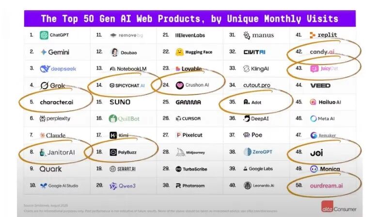 注:据a16z 今年 8 月发布的第五版榜单,连续霸榜的 AI 陪伴公司实际仍有不少。